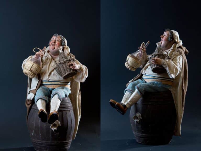 Nel panorama del presepe, spicca un personaggio dalla corporatura imponente e le guance arrossate, che di solito compare di fronte alla cantina con una bottiglia in mano o è ritratto seduto su una carretta carica di barili di vino, circondato da un seguito di uomini vestiti con pelli di capra, i quali, con zampogne e pifferi, scandiscono ritmi orgiastici che evocano l’essenza dionisiaca. Talvolta viene rappresentato semplicemente seduto su questi barili, intento a bere. La disposizione delle due grotte nel presepe non è casuale, ma simboleggia la stretta connessione tra il sacro e il profano, e la sottile linea che li divide, rappresentando l’eterna lotta tra il bene e il male. Questa tendenza a mescolare queste due realtà opposte emerse alla fine del XVII secolo, con l’intento di rappresentare la venuta di Gesù proprio nella vita quotidiana dei poveri e degli emarginati. Si scelse quindi di raffigurare pastori dall’aspetto umile, impoverito, spesso ubriachi, insomma tutti coloro che facevano parte del tessuto sociale dell’epoca. È per questo motivo che il personaggio in questione trova la sua collocazione all’interno della narrazione presepiale.